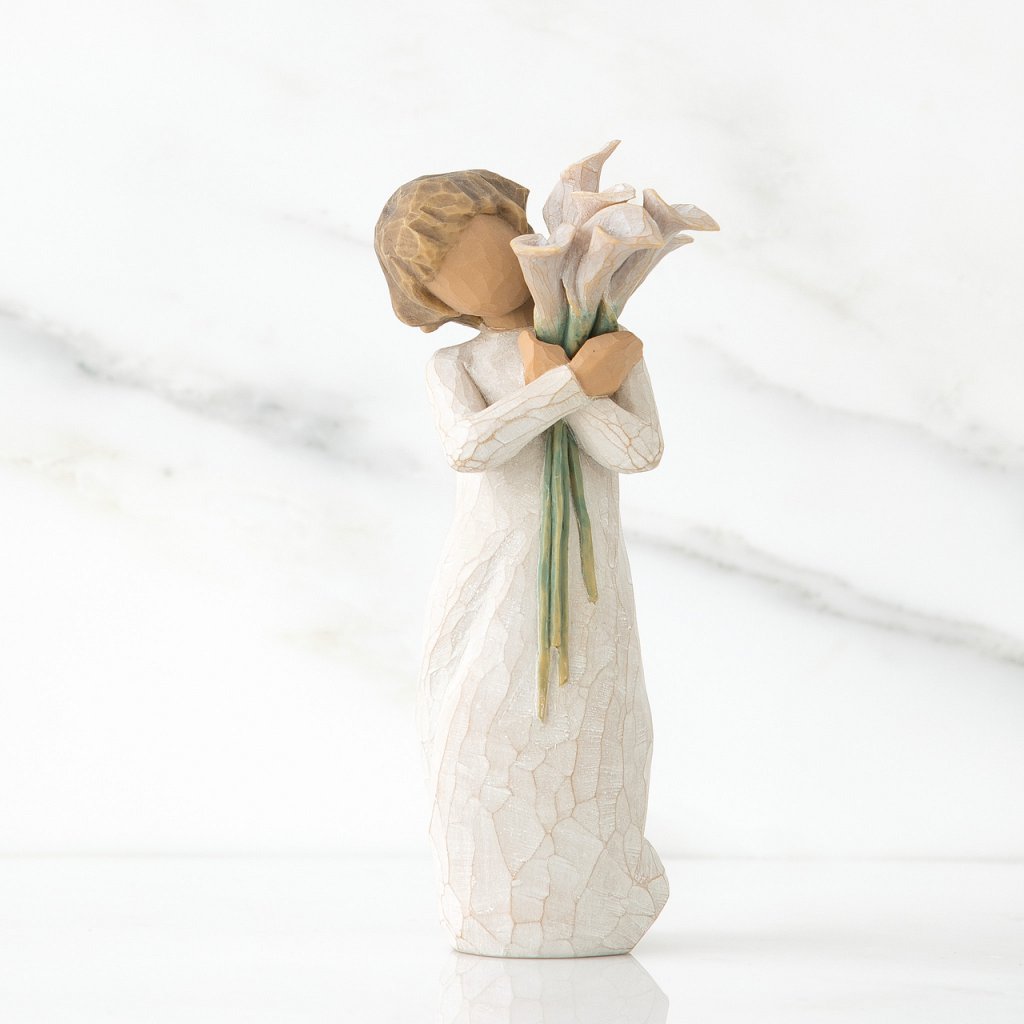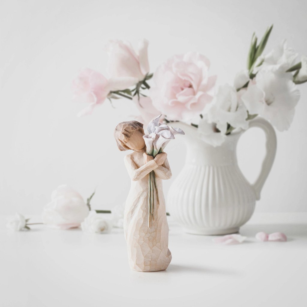 Produsele Willow Tree sunt fabricate dintr-o rășină sintetică care imită aspectul lemnului sculptat.